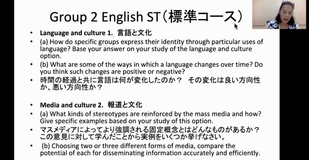 国際バカロレアには上級コースと標準コースある。標準コースの最終試験は、1)言語と文化、2)報道と文化、3)将来の課題、4)世界規模での課題、5)社会的課題、6)文学の問題の6つのカテゴリーで構成される。